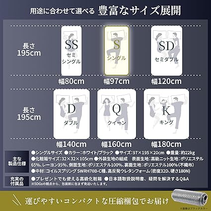 | 素材 | ○材質:スプリング SWRH-70B-C種 、高反発ウレタンフォーム(密度32D、硬さ180N) ○表面生地:高級ニット生地(レーヨン35%ポリエステル65%) ○裏面生地:ポリエステル100% |